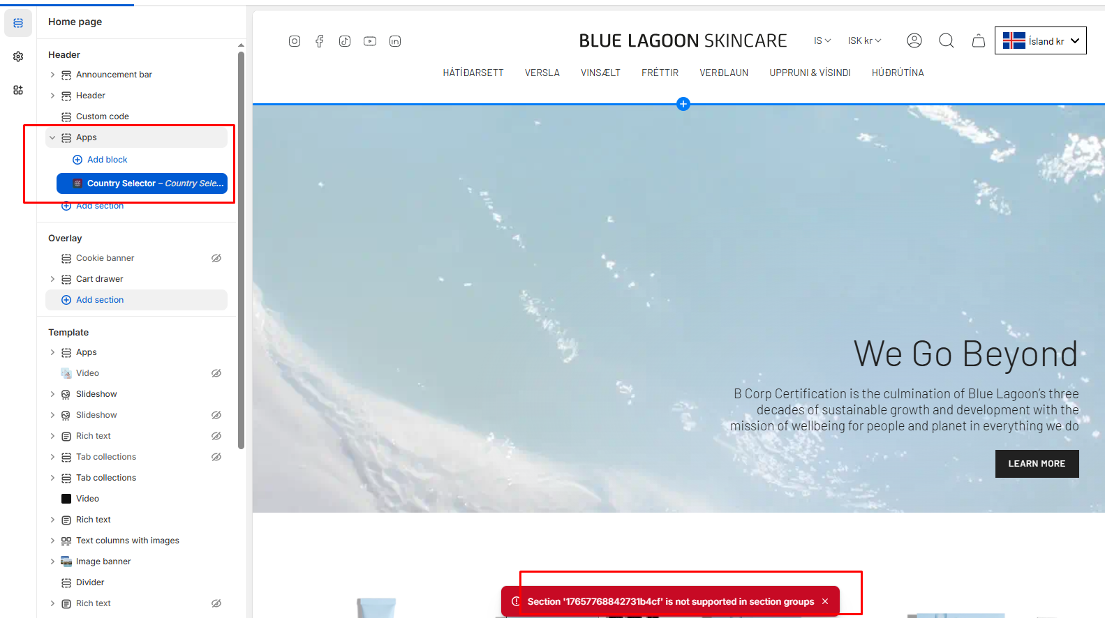 If you see a message like **“Section xxx is not supported in section groups”** when trying to add an app block to the header or footer, this is a **theme limitation**.